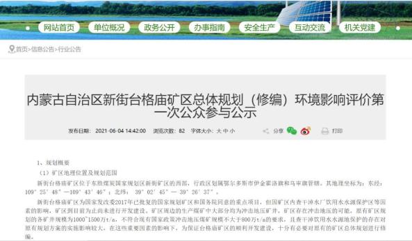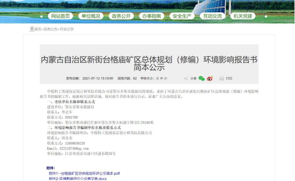 2021 年7月12日在鄂爾多斯市能源局政府網(wǎng)上進(jìn)行了第二次信息公示,同時(shí)在公示中附上了查閱報(bào)告書征求意見稿及公參意見表的公示鏈接,征求公眾對報(bào)告書征求意見稿的相關(guān)意見,公示時(shí)間共計(jì)為10個(gè)工作日。向公眾公告以下信息: