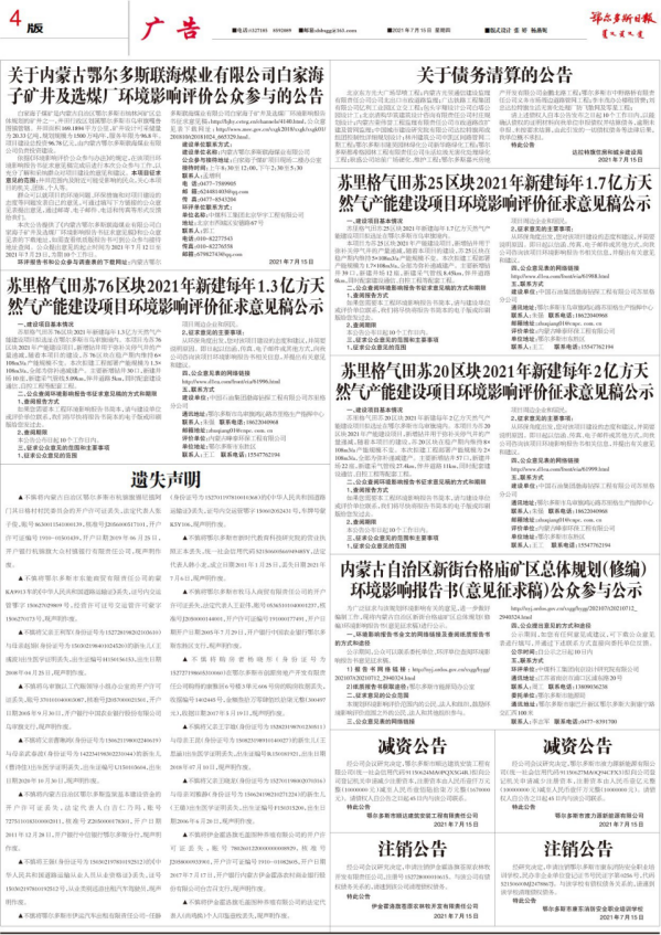 在第二次網(wǎng)絡(luò)公示期間,分別在2021年7月15日和2021年7月19日在鄂爾多斯日報(bào)報(bào)紙上進(jìn)行了兩次登報(bào)公示,每次公示時(shí)間為5個(gè)工作日,報(bào)紙公示截圖詳見下圖。
